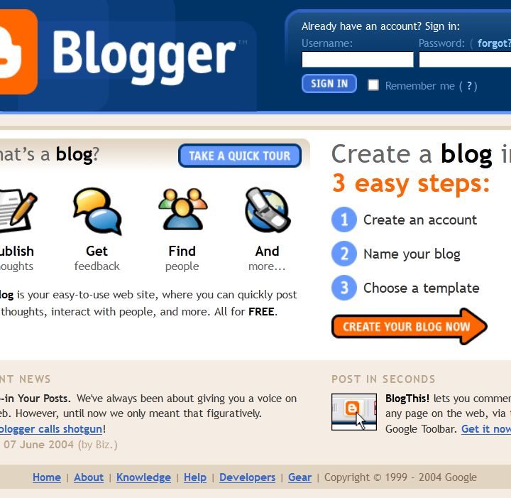 Una de las plataformas que ayudó a masificar esta práctica fue Blogger, creada por una pequeña empresa llamada Pyra Labs el 23 de agosto de 1999. Blogger se lanzó como un producto gratuito que ayudó a popularizar la idea de crear un weblog. O un blog, nombre que se adoptaría con el tiempo.