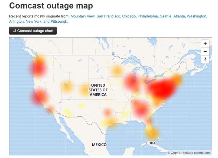 Desde tempranas horas, la cuenta de negocios de Twitter de Comcast solo confirmó que el servicio de telefonía empresarial había caído, aunque un gran número de clientes también informaron en el servicio detector Down Detector que la interrupción también estaba interrumpiendo el acceso a internet en grandes ciudades a lo largo de todo el territorio estadounidense, como puedes ver en el siguiente mapa.