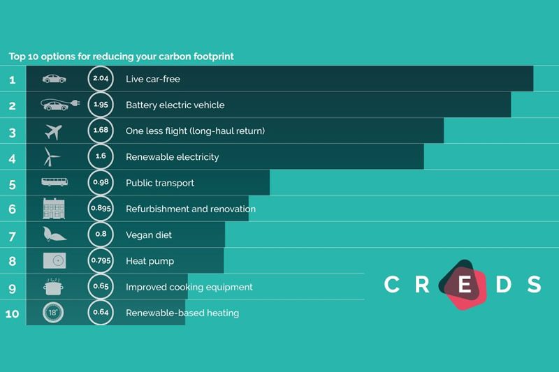 Liberándose del automóvil a gasolina, una persona dejaría de emitir 2.04 toneladas de gases de efecto invernadero cada año. Adoptando uno eléctrico, la economía sería de 1.95, mientras que evitando un vuelo de larga distancia se ahorrarían 1.68 toneladas. Usar el transporte público aportaría con 0.98.