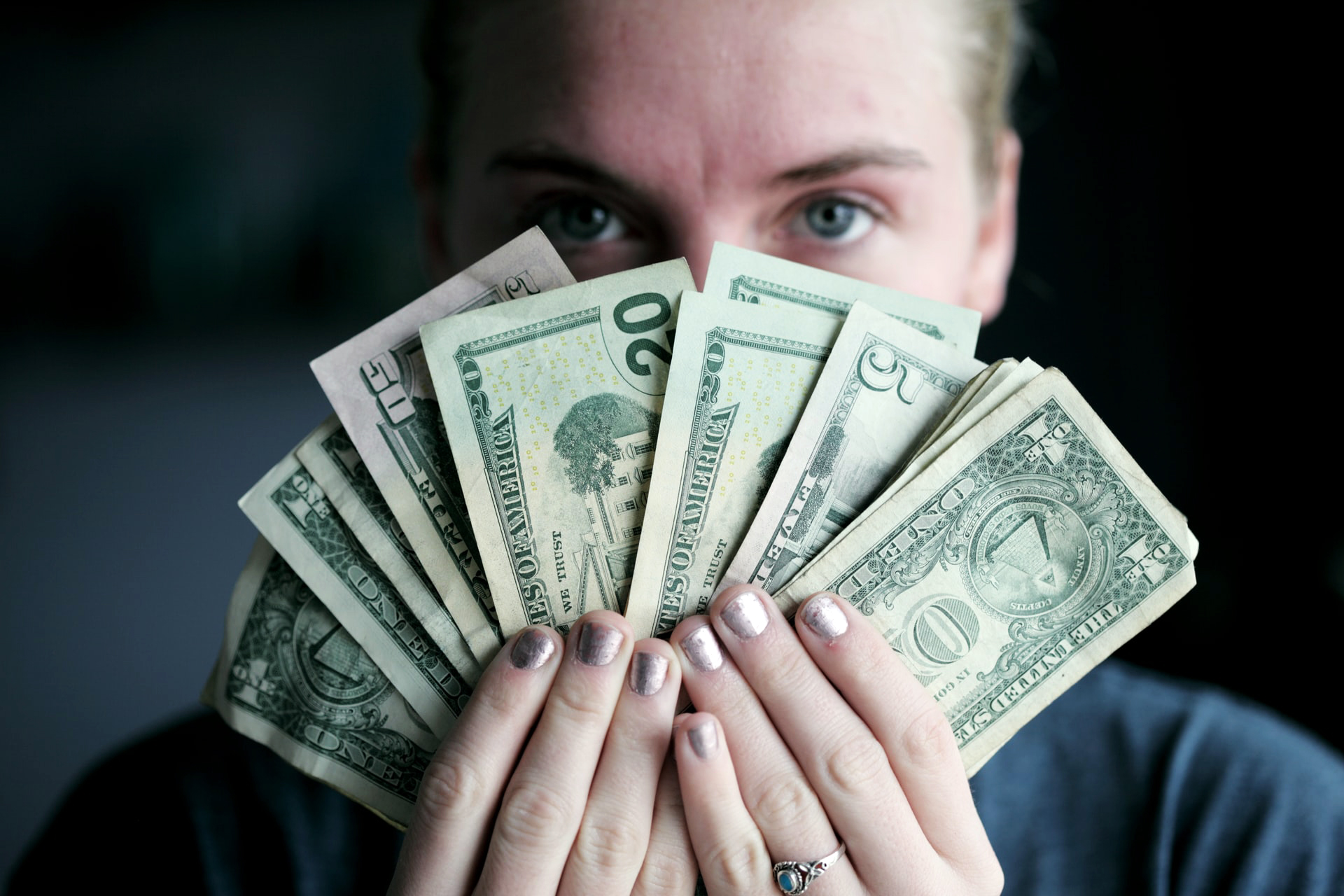 Una chica asoma sus ojos detrás de un abanico de dólares que sistiene frente a su rostro.