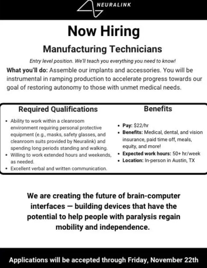 A los técnicos de fabricación en Texas se les pagaría una tarifa plana de 22 dólares por hora para producir implantes cerebrales y accesorios, y se les exige que trabajen “horas extendidas y fines de semana, según sea necesario”. En California, a los técnicos se les pagaría entre 28,85 y 44,23 dólares por hora para fabricar el robot quirúrgico R1, que está diseñado para automatizar completamente la implantación de la interfaz cerebro-computadora de Neuralink.