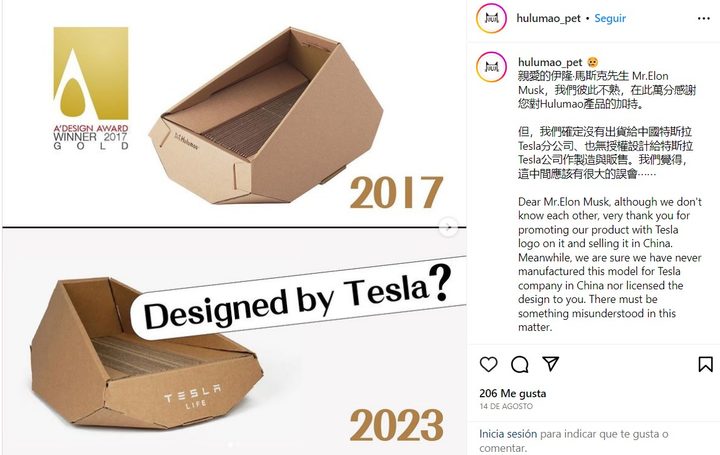 No es su rubro para nada, sin embargo, Tesla está comercializando una cama de cartón para gatos en China. Pero según lo descubierto por el medio de comunicación Focus Taiwan, dirigido por Taiwán, una empresa local llamada Hulumao es quien tuvo la idea original, acusando a la empresa de Elon Musk de plagio.