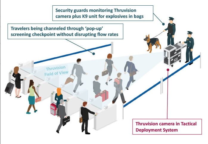 La empresa británica de tecnología de seguridad Thruvision, que fabrica los escáneres de $100.000 dólares, dice que el sistema se puede configurar y activar en solo 15 minutos. Se dice que la tecnología es capaz de identificar elementos sospechosos a una distancia de hasta 30 pies (9 metros), dando a los funcionarios el tiempo suficiente para identificar, monitorear y quizás interrogar a una persona de interés.