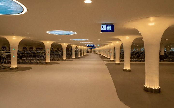 Inaugurado oficialmente por la Ministra de Medio Ambiente, Vivianne Heijnen, el miércoles (25 de enero), la estructura puede acomodar 7,000 bicicletas estacionadas, lo que la convierte en el estacionamiento de bicicletas más grande de Ámsterdam. El interior amplio y luminoso se basa en temas basados en el agua y se accede desde el nivel de la calle por pasarelas estacionarias y móviles.