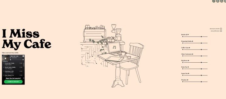 I Miss My Cafe es una aplicación web que se conecta a Spotify para permitirte crear tu mezcla de ruido de fondo perfecta para el trabajo. Hay miles de mezclas de «días lluviosos» en YouTube, pero no se pueden personalizar. Aquí, usted controla el volumen y el tipo de ambiente que se reproduce en la lista de reproducción. Me gusta que te permite elegir entre algo más ruidoso y algo más tranquilo; Es muy fácil adaptarlo a tus necesidades actuales.