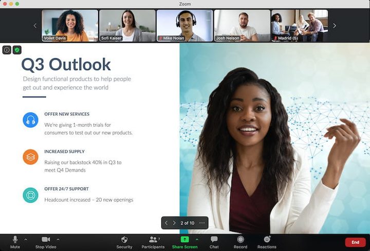 Las reuniones de Zoom pueden ver hasta 49 participantes, y desde el 15 de septiembre de 2020, los usuarios de Google Meet también (pero solo en la versión web). Para usar una pizarra o realizar encuestas a los participantes en Google Meet, tienes que abrir una aplicación independiente como Chrome Canvas o Jamboard para colaborar. Por el contrario, Zoom tiene una pizarra y funciones de sondeo integradas.