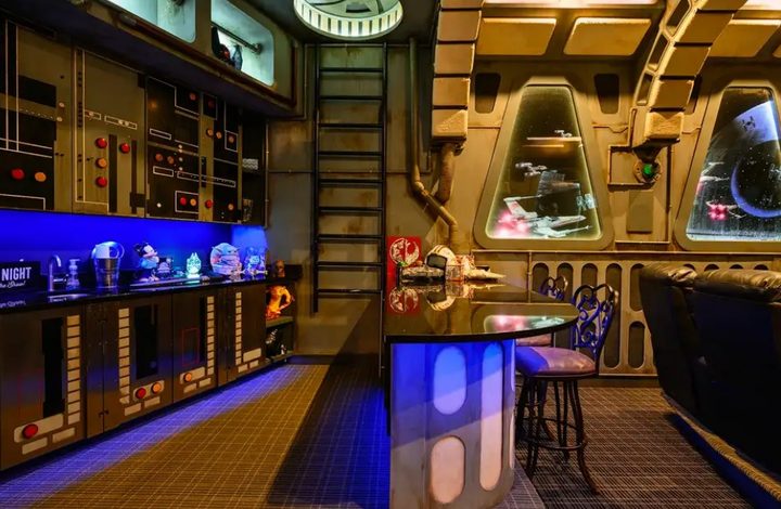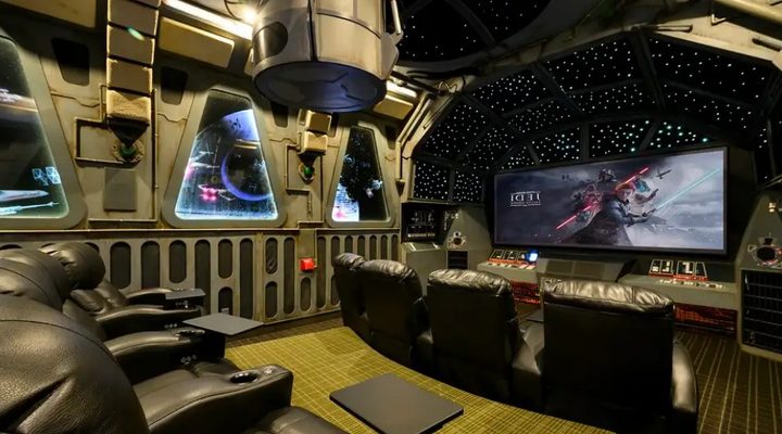 Aunque no es una réplica perfecta de la cabina del Halcón Milenario, este teatro combina una pantalla gigante con asientos de cuero de felpa, interfaces de computadora aleatorias, estrellas simuladas por la ventana delantera y paneles iluminados en las paredes que brindan una visión de la batalla contra la segunda Estrella de la Muerte. También hay un bar y una mini cocina en la parte trasera y una sólida colección de juguetes y recuerdos de Star Wars.