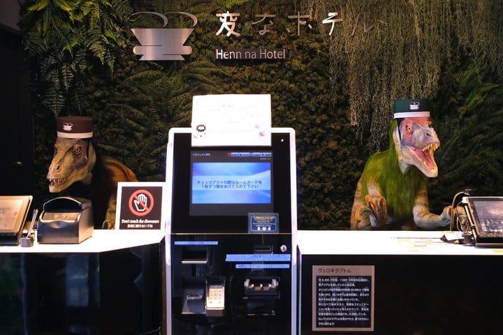Un par de dinosaurios-robot velociraptor, que trabajaban en el registro de bienvenida en el hotel, también tuvieron que ser retirados ya que terminaron siendo incapaces de hacer muchos de los trabajos requeridos de un recepcionista. Además, otro robot que debería hacer el trabajo de “botones” o conserje fue reemplazado por un humano capaz de responder preguntas importantes para turistas, como direcciones o las atracciones cercanas. Los humanos ahora también van a llevar nuevamente el equipaje hasta las habitaciones, puesto que los robots supuestamente encargados de esa labor rara vez pudieron llegar hasta la puerta exacta de los huéspedes, y solo en condiciones climáticas óptimas.