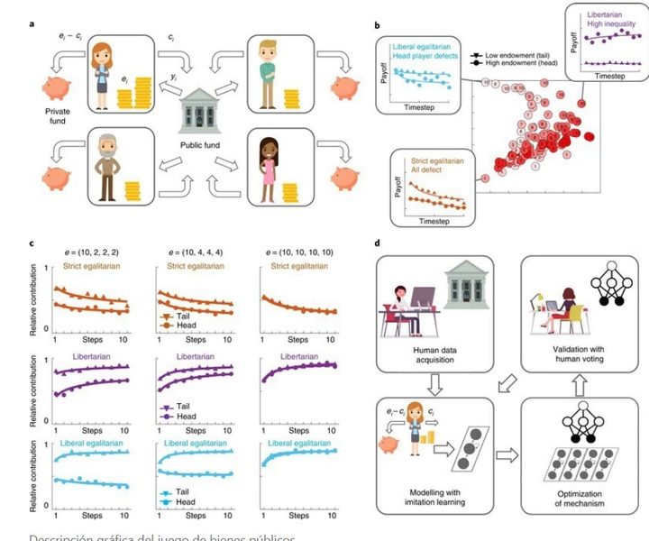El estudio revela una serie de experimentos en los que una red neuronal se encarga de dividir los recursos de forma equitativa, y como los humanos prefiriesen. Para ello, los participantes jugaron de manera online al juego de bienes públicos, un tipo de juego basado en la economía experimental. En este juego, se reparten una serie de fichas o monedas de forma equitativa, y en cada ronda, el jugador decide si mantenerlas en un fondo privado e individual, o contribuir en un fondo público.