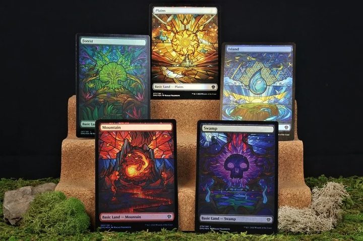 La atmósfera de fantasía original de Magic se mostrará además con el estilo Stained Glass de arte completo, disponible para las cinco tierras básicas, las criaturas legendarias, los planeswalkers y las aterradoras cartas pirexianas. Cada una de ellas podrá ser adquirida en sus versiones foil y no foil dentro de los sobres de Edición, de Draft y de Coleccionista.