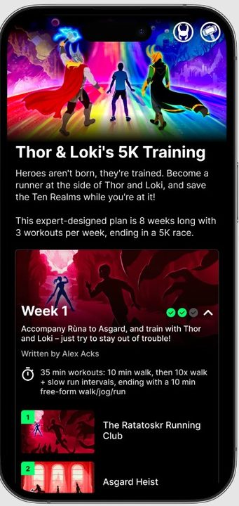 Las historias, según Hon, varían en longitud. Por ejemplo, la historia de Thor es una saga de 24-25 episodios en la que podrás correr un 5K al final. El desafío es incorporar razones naturales basadas en historias por las que podría estar ejecutando un intervalo de 30 segundos seguido de una caminata de 15 segundos. Y aunque no hay niveles de dificultad específicos para ninguna de las historias, Hon dice que la historia de Thor fue diseñada pensando en los principiantes.