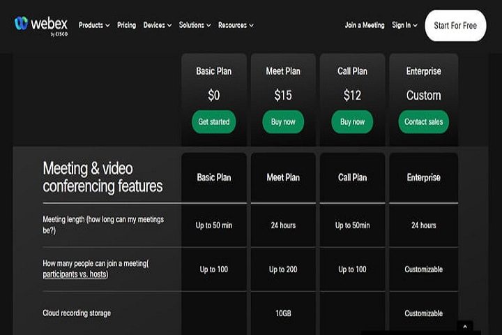 Además de la versión gratuita, Webex también ofrece planes premium que empiezan en $12 dólares mensuales, por licencia. Estos planes premium ofrecen funciones adicionales que incluyen almacenamiento en la nube, grabación de transcripciones, llamar a cualquiera con un número telefónico, correo de voz visual, grabaciones MP4, y más