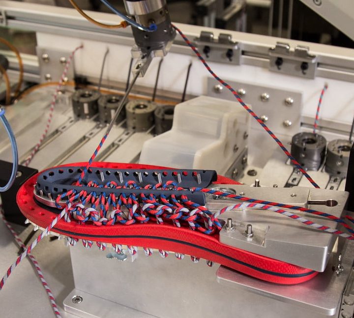 Cuando se activan, los dos brazos trabajan juntos para crear un par personalizado de sandalias Uneek, seleccionando automáticamente el cordón de color adecuado antes de tejerlo a través de los otros componentes del zapato.