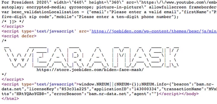 Lo mejor de todo para el ex vicepresidente de Barack Obama es que el código fuente del sitio web también incluye la dirección web de una máscara facial oficial Biden de $ 20 en la tienda Team Joe.