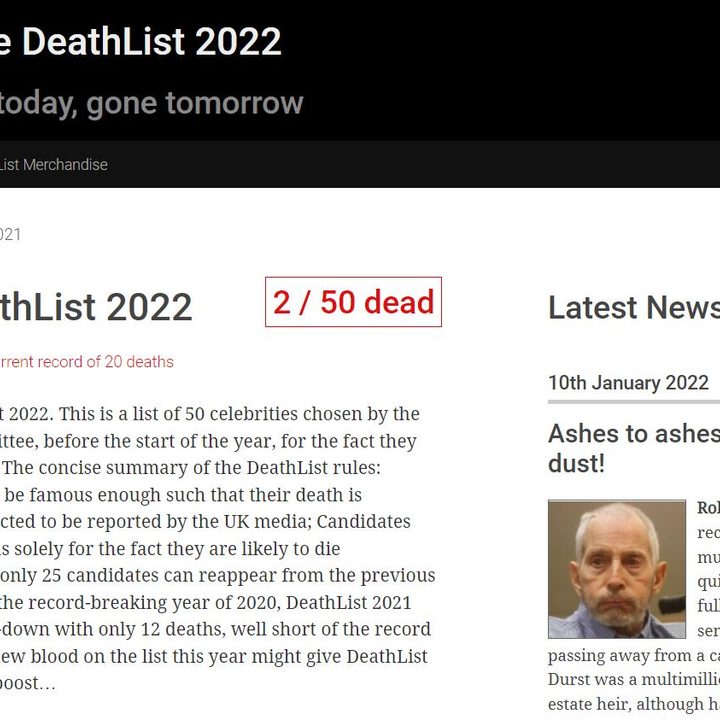 La mayoría de los nombres en la lista tienen más de 90 años, pero a pesar de su edad, muchos todavía gozan de una salud increíblemente buena. Por esa razón, quizá 2022 será otro año decepcionante para The DeadList.