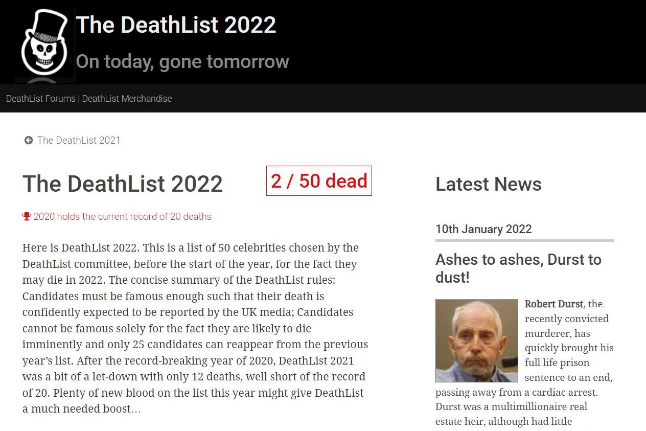 Cabe señalar que The Deathlist ya registró un acierto a comienzos de enero, cuando se confirmó el fallecimiento del actor Sidney Poitier a los 94 años; fue el primer afroamericano en ganar el Óscar al mejor actor. El otro acierto que lleva el sitio hasta el momento es la muerte del millonario empresario Robert Durst, quien fue declarado culpable de asesinar a su amiga Susan Berman en 2000.