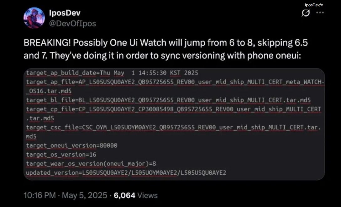 Según el usuario de X IposDev y las fuentes de SamMobile, Samsung pasará directamente de One UI 6 Watch a One UI 8 Watch. Aparentemente, la compañía está haciendo esto para hacer coincidir el software de su reloj inteligente con el de sus teléfonos.