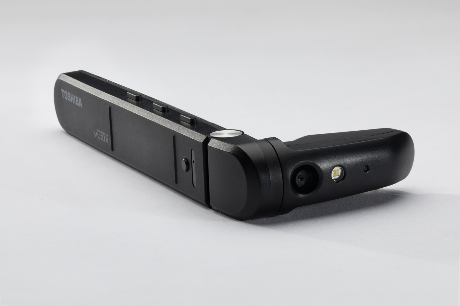 Se conecta al wearable llamado Toshiba AR100 Head Mounted Display, un dispositivo de 3 onzas con una micropantalla, similar a la que se encuentra en Google Glass. Gracias a un ingenioso clip, se puede usar ya sea en el lado izquierdo o derecho de anteojos, gafas protectoras o cualquier otra cosa que podrías acomodarte en la cara.