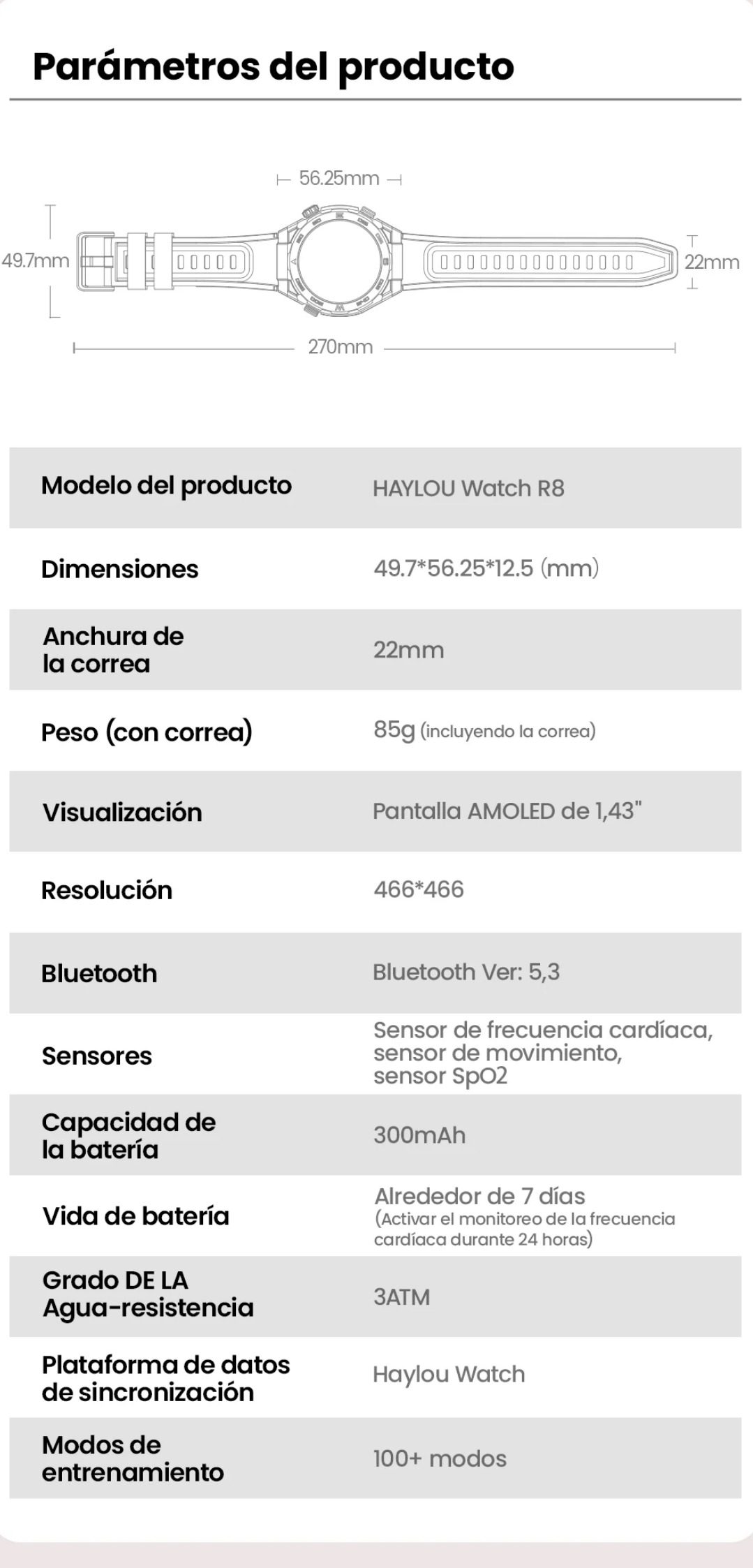 Una de las mejores características del Haylou Watch R8 es que es un reloj deportivo inteligente con una seguridad de estándar militar, con mucha resistencia a golpes con una fuerte cubierta de vidrio. Esta estética robusta va acompañada con una pantalla AMOLED de alta definición de 1,43 pulgadas, con un diámetro de 49,7 mm y con un peso de 85 g.