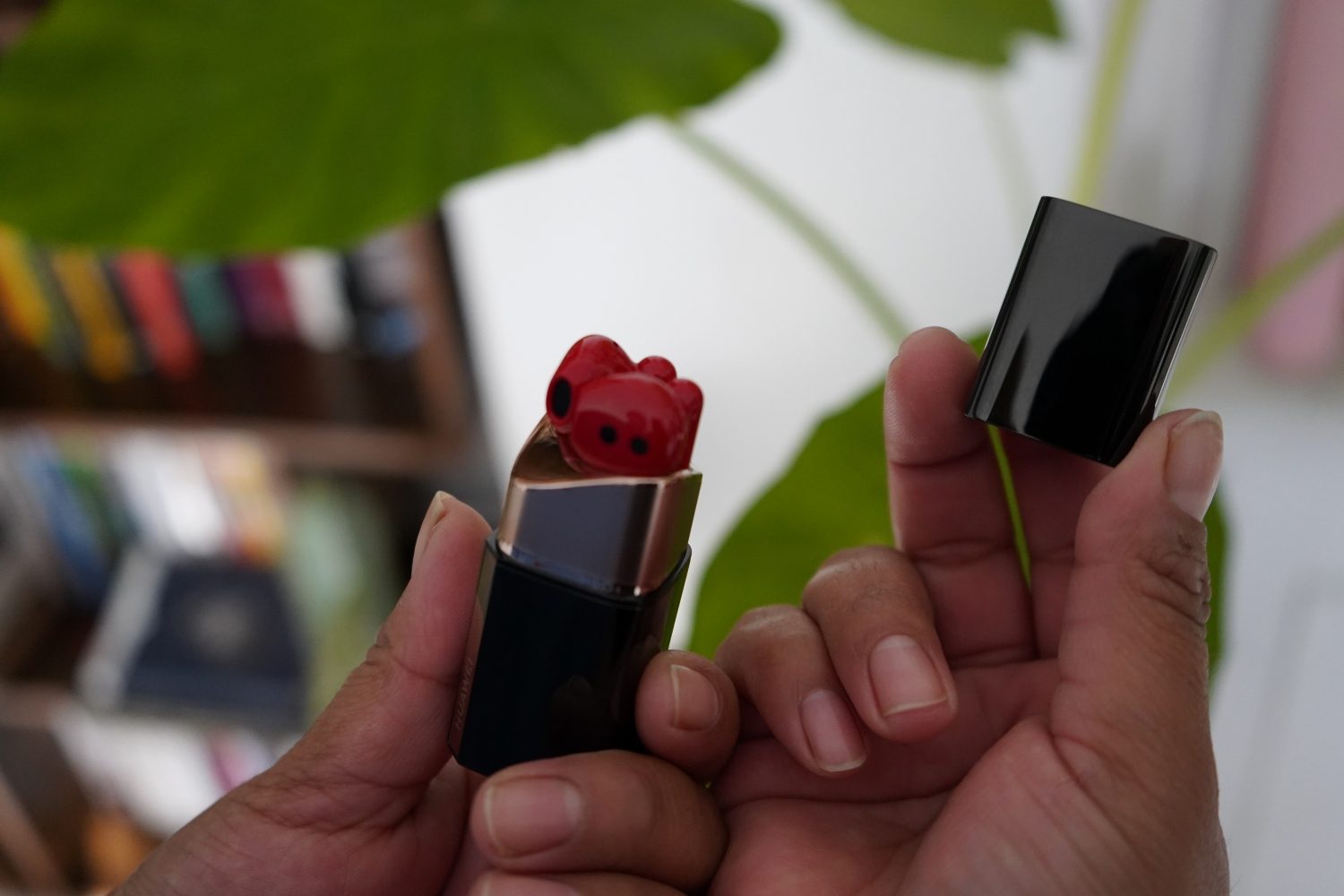 Se trata de los FreeBuds Lipstick que, como su nombre indica, tienen el diseño de un lápiz o barra de labios. El estuche de carga está fabricado en acero inoxidable de color dorado y negro, y en su interior encontramos la pareja de auriculares de color rojo.