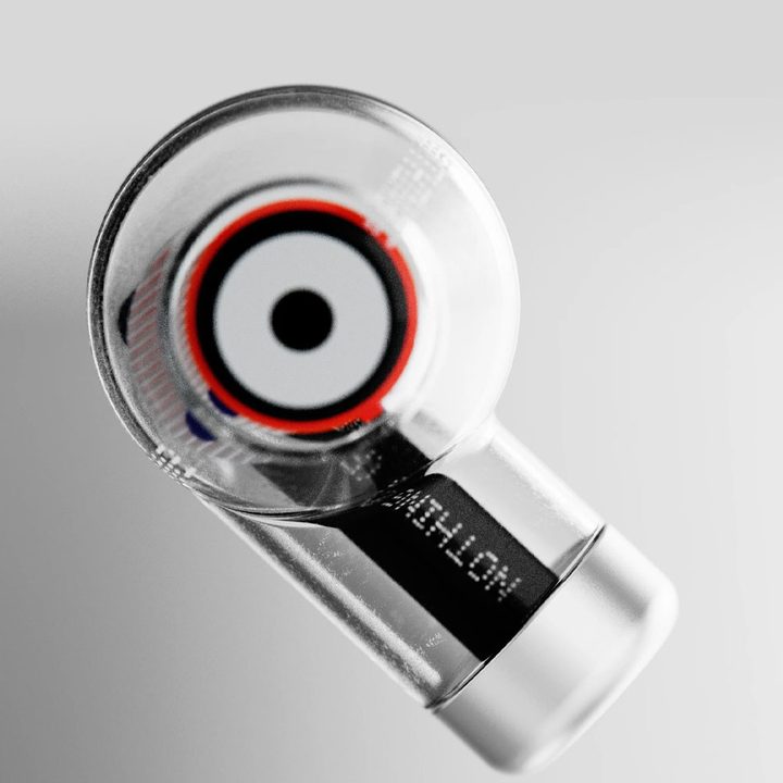 En la imagen compartida por la compañía se puede ver un auricular transparente con un diseño de diana rojo, blanco y negro, y en el que podemos leer la palabra “Nothing” grabada en el módulo interno del dispositivo.