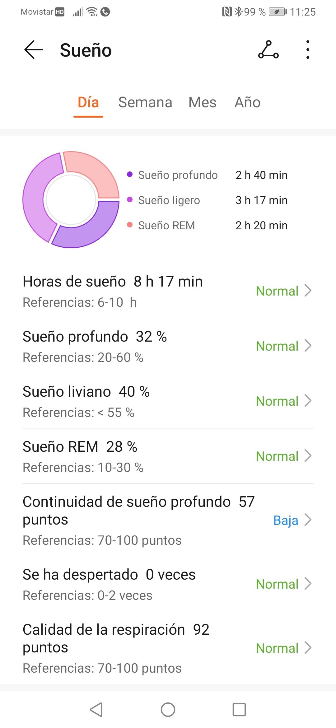 Si te preocupa el estrés, este reloj también lo registra y te dice si el nivel es normal o no (tú mismo puedes hacerte una prueba para comprobarlo en cualquier momento). Si te quieres relajar, abres la aplicación de ejercicios de respiración que dura un minuto. Si estás interesado en conocer cómo duermes, la medición del sueño es muy detallada en este reloj: en la app Salud te indica a qué hora te metes y te levantas de la cama, tiempo de sueño profundo, ligero y REM, cuántas veces te despiertas, continuidad de sueño profundo, si te acuestas más tarde de lo aconsejable y hasta la calidad de la respiración mientras duermes.