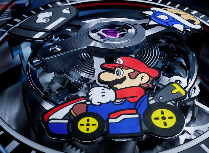 La versión más premium consiste de un cronógrafo tourbillon, que también está plagado de detalles relacionados con Mario Kart. La caja de 45 milímetros es de titanio de grado 5 y también muestra el logotipo del juego en la escala taquimétrica. Pero el detalle que verdaderamente le identifica es la esfera esqueleto tri-compax, que muestra un tourbillon personalizado con Mario y dos ítems típicos de las carreras: un caparazón azul con púas y una Bill Bala. La correa también es de piel de becerro, en negro y rojo.