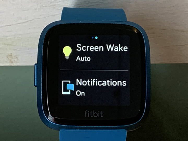 La Vista rápida, también llamada Activación de pantalla, enciende la pantalla cuando levantas la muñeca. Simplemente presiona y mantén presionado el botón lateral del Versa Lite para abrir la pantalla de configuración rápida. Pulsa sobre Activar pantalla para cambiar entre los modos manual (presionando el botón) y automático (levantando la muñeca).