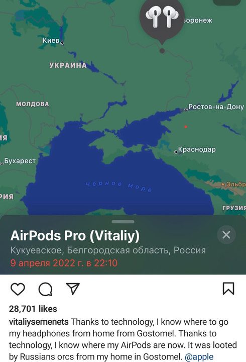“Gracias a la tecnología, ahora sé dónde están mis AirPods. Fue saqueado por orcos rusos de mi casa”, un mensaje que además ayudó a varios otros ucranianos a saber dónde estaba el asedio de Rusia.