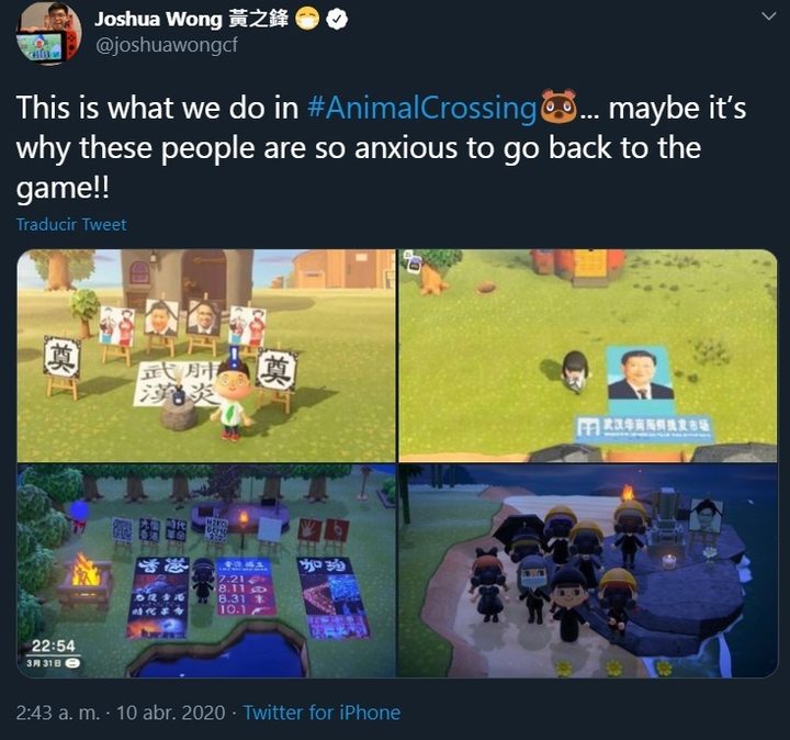 Reuters relata la secuencia y señala que, “Joshua Wong, un activista por la democracia en Hong Kong, llevó sus protestas al juego la semana pasada y publicó en Twitter una captura de pantalla de su isla decorada con una pancarta que decía: “Hong Kong libre, revolución ahora”.