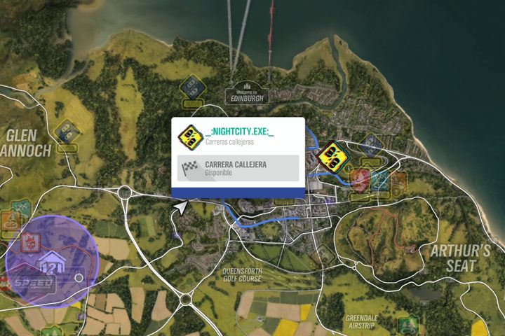 El evento en cuestión se llama _:NIGHTCITY.EXE:_ y aparece en la parte noreste del mapa, en medio de lo que es la ciudad de Edimburgo. Este evento no tendría que ser muy difícil de encontrar en medio de todos los otros, principalmente gracias al ícono de la carrera que es algo diferente al del resto de eventos de la zona.