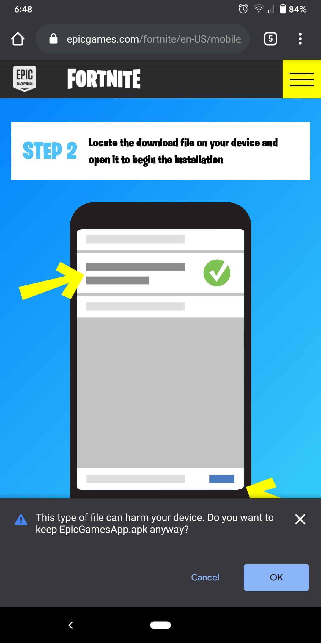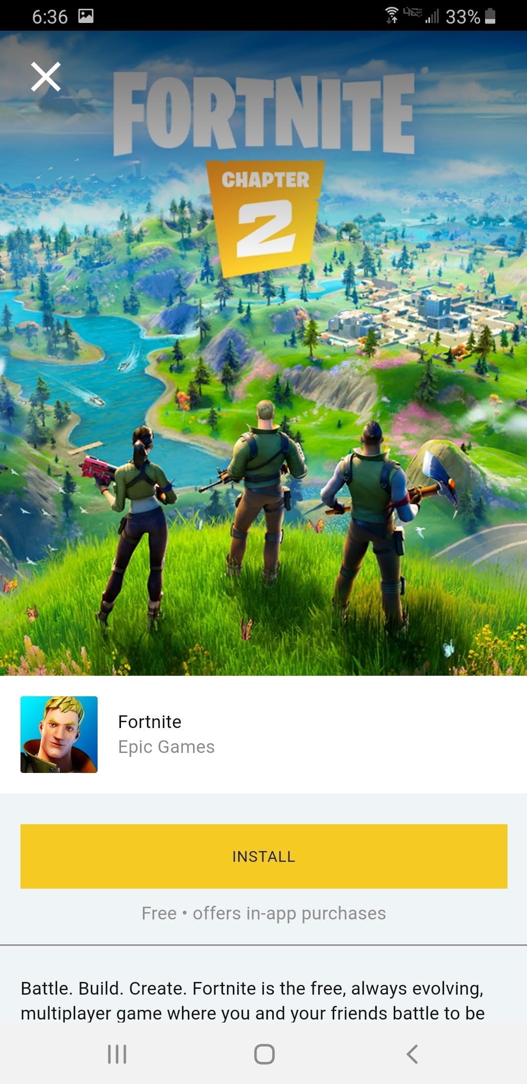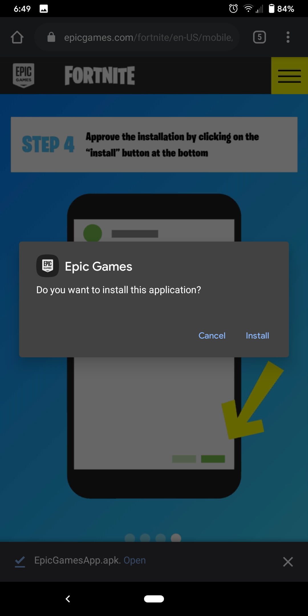 Deberás comenzar descargando la aplicación Epic Games directamente desde el sitio web. Acceda a ese enlace en tu dispositivo Android, busca en Google «Fortnite Android», o escanea el código QR con tu dispositivo Android. Cuando hayas descargado el archivo, tócalo y presiona Instalar cuando te lo pidan. Es posible que debas otorgar permisos de almacenamiento para completar este proceso.