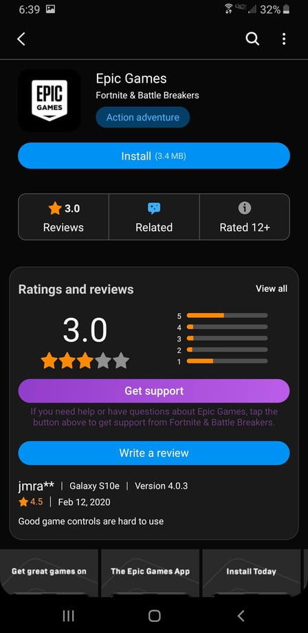 Debes comenzar accediendo a la aplicación Galaxy Store en tu dispositivo Samsung. Cuando la tienda se cargue, busca la aplicación Epic Games. Descarga e instala la aplicación para continuar. Cuando lo completes, abre la app y luego encuentra Fortnite. Aquí es donde debes instalar la aplicación principal del juego.