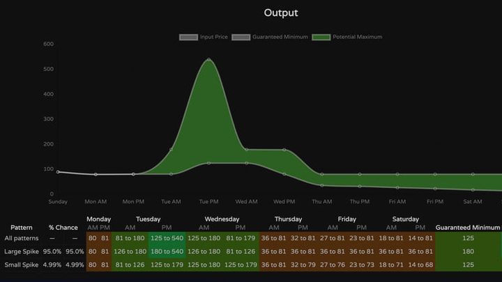 Para ganar a lo grande, puedes ir a Turnip Prophet o a la calculadora de nabos ACNH y conseguir estimaciones de cuánto puedes ganar en un día determinado, es el equivalente de la información privilegiada de Animal Crossing. Gracias a los extractores de datos de ACNH, sabemos que Nintendo programó cuatro tipos de patrones de precios en una semana determinada. Sitios como Turnip Prophet pueden tomar el precio de tu venta del domingo y escupir probabilidades sobre si los precios de Nook serán aleatorios, bajarán constantemente durante toda la semana, subirán un poco de 150-200 campanas o saltarán al rango de 300-660.