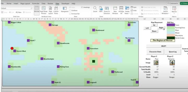 El youtuber explica que su juego tiene dos componentes: “Mapping and Questing” y “Battling”. Puedes moverte por las distintas áreas del entorno RPG bombardeado.