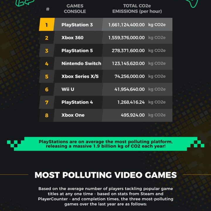 Según Mobile Wins, la consola más contaminante de la historia es la PlayStation 3, seguida muy de cerca de la Xbox 360. En conjunto, ambas consolas producen un estimado de 7,286,200 kilogramos de dióxido de carbono por hora (toma en cuenta que esa cifra contempla 171 millones de consolas encendidas al mismo tiempo). ¿Eso es mucho o es poco? Depende el cristal con el que se mire, pero si lo comparamos con otras prácticas como el streaming, resulta que el entretenimiento del siglo XXI es sumamente contaminante.