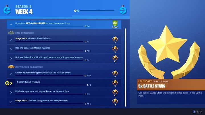 Como es usual, hay un total de siete objetivos para cumplir durante la cuarta semana de la octava temporada. Entre esos siete, tres se encuentran disponibles para todos los jugadores, y los cuatro restantes son exclusivos para aquellos que tengan el pase de batalla. Sin embargo, hay una posibilidad de que ya tengas el pase de batalla gracias al evento de tiempo extra en la temporada anterior.