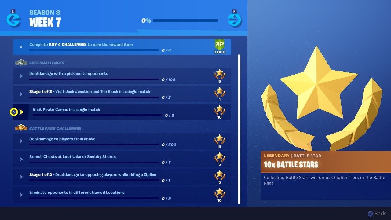 Esta semana marca el comienzo de la semana siete de desafíos de la temporada ocho de Fortnite. Este nuevo set de objetivos recién salidos del entorno giran en torno a la temática pirata nuevamente, la cual ha sido el foco principal esta temporada del videojuego Battle Royale. Pero a su vez había estado algo ausente desde el desafío de desenterrar un tesoro hace unas semanas. Desafortunadamente, eso no significa que se traten de desafíos destacables para esta semana. De hecho, son bastante simples.
