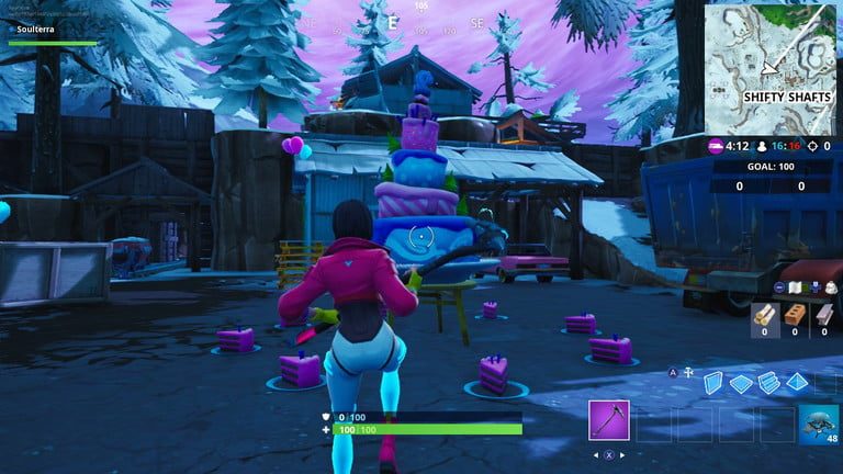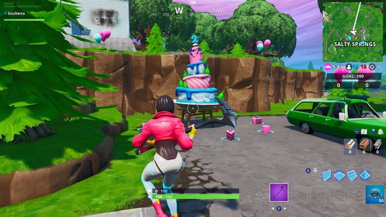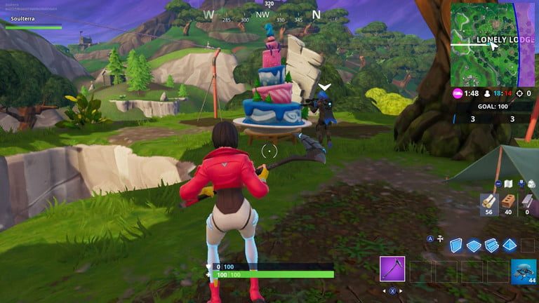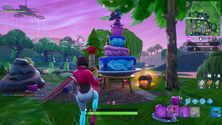 Las últimas tres locaciones están bastante cerca entre si, y es probable que tengas que ir a otra partida para las mismas. Dirígete hacia Lonely Lodge en el extremo este de la isla, y luego al medio del área boscosa donde hay una roca gigante. Tendrás que aterrizar ahí o construir una rampa hacia la cima, donde encontrarás el pastel.