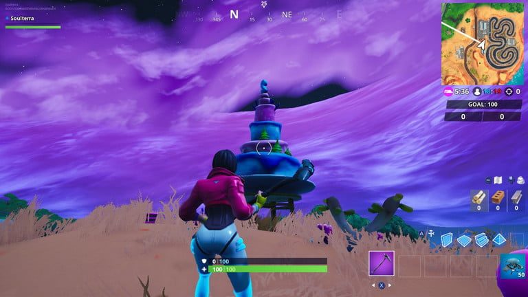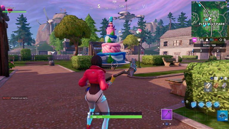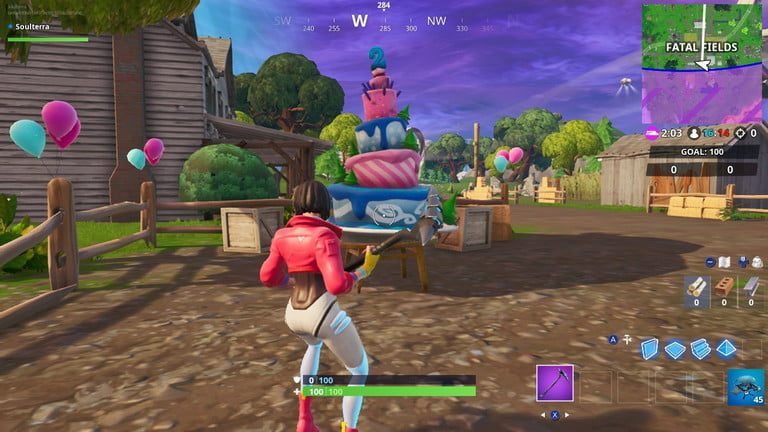 La siguiente ubicación se encuentra en Pleasant Park. Si vas desde Junk Junction, querrás ir al sureste. Cuando llegues, dirígete hacia el centro de la ciudad y busca por el extremo norte del campo de fútbol. El pastel que buscas se encuentra en el lado oeste del mismo.