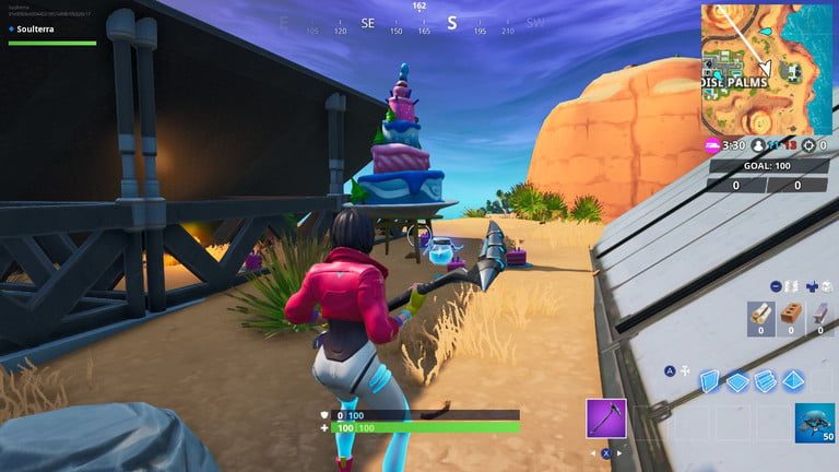 El primero que recomendamos visitar se encuentra en Junk Junction. En el centrado de esta área, encontrarás un pastel gigante que se ve igual que en nuestra captura aquí arriba.