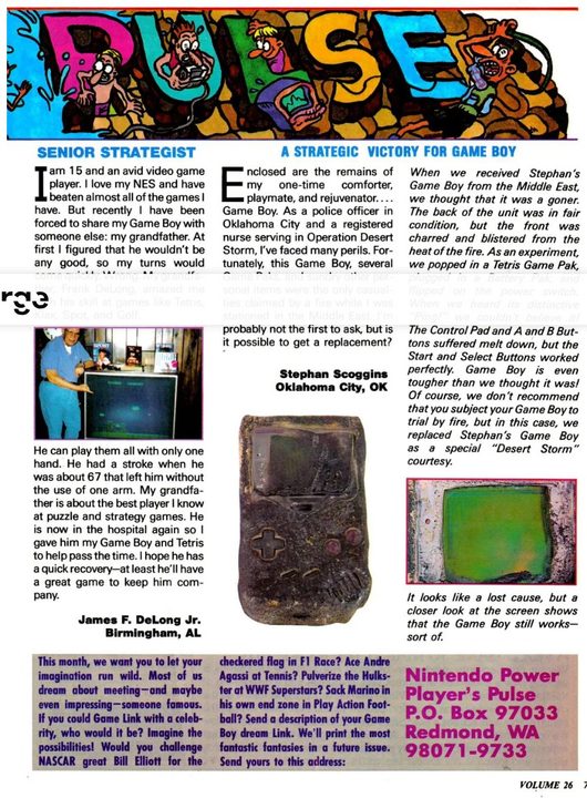 «Cuando recibimos la Game Boy de Stephan de Oriente Medio, pensamos que estaba agonizando. La parte trasera de la unidad estaba en buenas condiciones, pero el frente estaba carbonizado y ampollado por el calor del fuego. Como experimento, introdujimos un Tetris Game Pak, conectamos un Battery Pak y encendimos el interruptor de encendido. Cuando escuchamos su distintivo «¡Ping!» ¡no podíamos creerlo! El panel de control y los botones A y B sufrieron una fusión, pero los botones Inicio y Selección funcionaron perfectamente. ¡Game Boy es aún más difícil de lo que pensábamos! Por supuesto, no recomendamos que sometas a tu Game Boy a prueba de fuego, pero en este caso, reemplazamos la Game Boy de Stephan como una cortesía especial de «Tormenta del desierto».