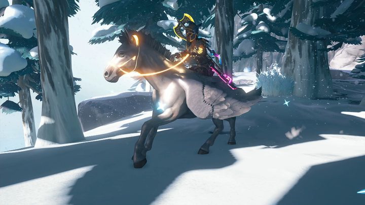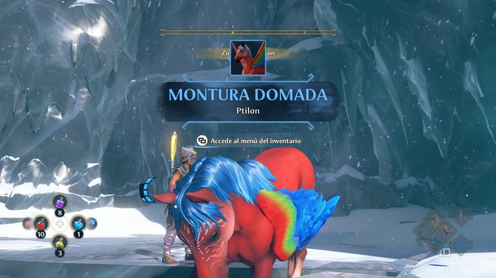 Ptilon es un caballo alado con plumas multicolor y se encuentra en una pequeña planicie congelada en medio de la montaña. Domarlo no es nada complicado a estas alturas y menos todavía si se tiene la habilidad para hacerse invisible; además, no hay enemigos alrededor que molesten o sean una distracción. Pero claro, llegar a esta zona es más factible después de unas cuantas decenas de horas de juego.