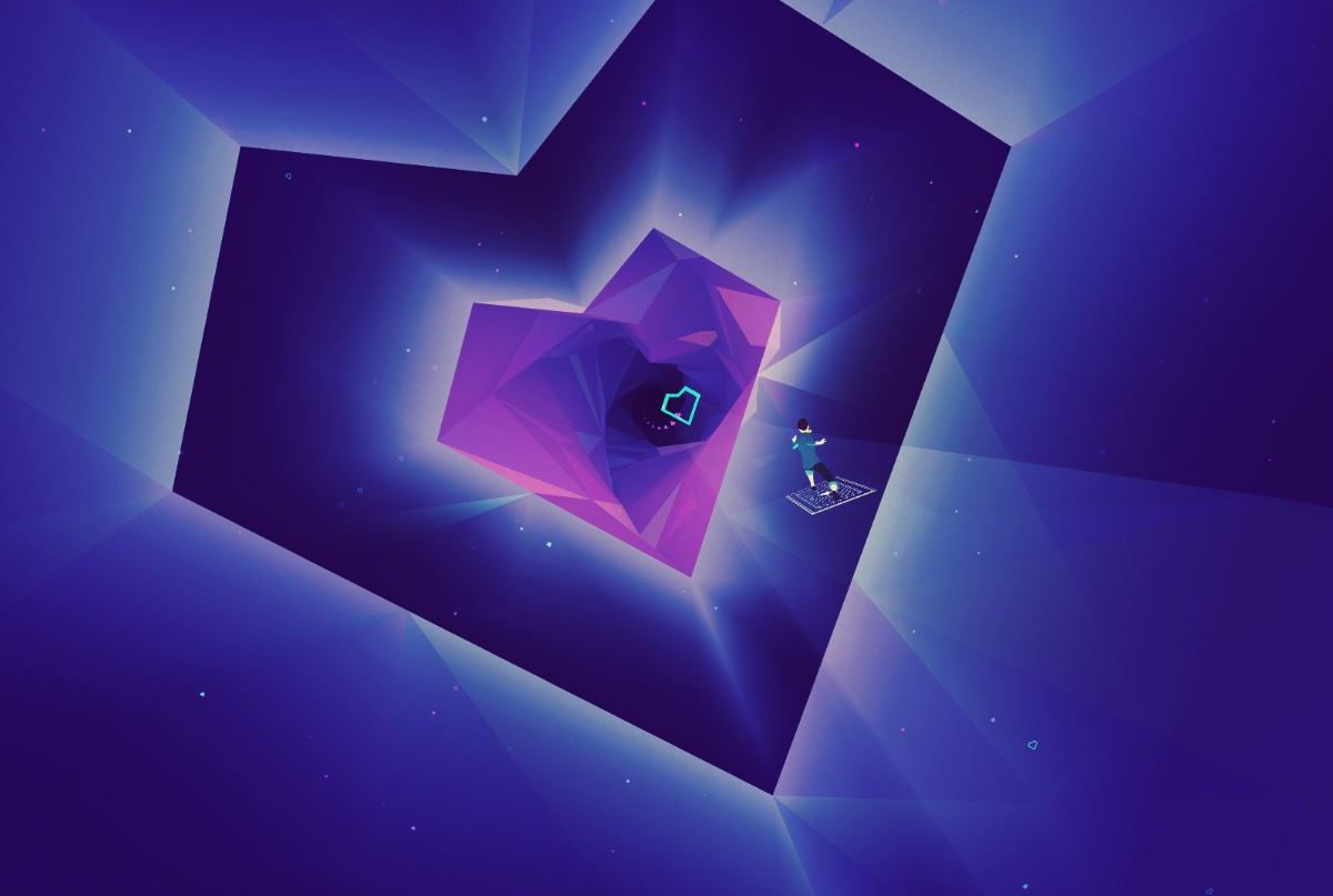 Aquí es donde llega The Fool, representada por una mariposa bastante particular que llega a la habitación de una joven. De repente, todo empieza a cambiar alrededor, y ella es transportada a un mundo muy distinto al nuestro. Utilizando una patineta, comenzamos a coleccionar corazones y dar saltos a través de autopistas etéreas que no hacen más que cambiar de forma. Así comienza Sayonara Wild Hearts, y déjenme decirles que la experiencia sólo se pone aún más alocada con el tiempo.
