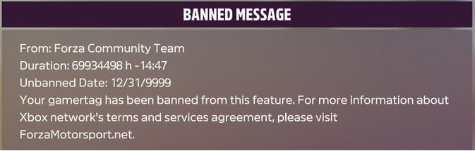 El baneo fue ejecutado por el equipo de moderación de Forza, que al parecer no está a cargo del desarrollador del juego (Playground Games) sino de Turn 10, los creadores de la serie original. El mensaje entregado al usuario dice que el 31 de diciembre del año 9999 podrá volver al juego, lo que significa que su vida en Forza Horizon 5 se acabó para siempre.