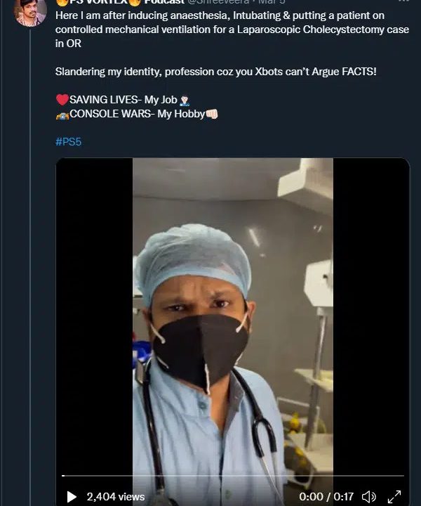 Mientras Shreeveera —quien aparentemente presenta un podcast llamado PS Vortex en defensa de PlayStation— discutía con los fanáticos de Xbox sobre qué consola era superior, muchos de sus combatientes en línea cuestionaron si era un médico de verdad. Y para demostrar su legitimidad, este compartió un video de sí mismo con ropa médica dentro de una sala de operaciones.