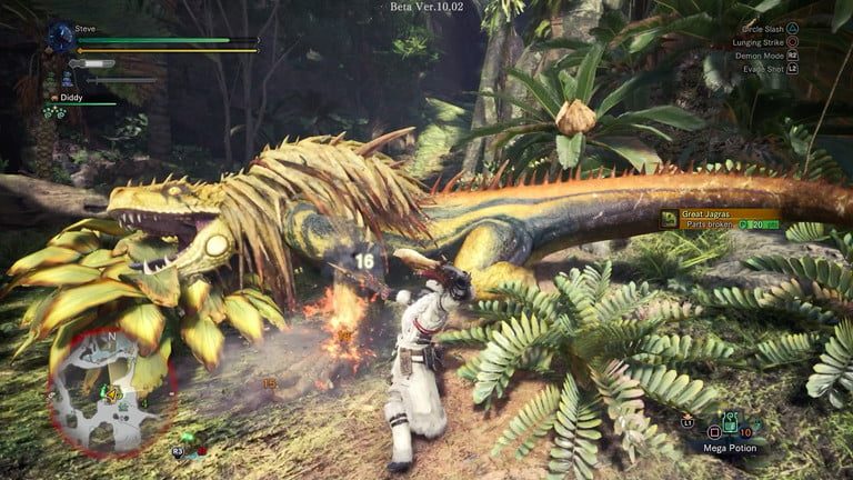En la mayoría de los encuentros con Great Jagras lo puedes ver comer, lo que convierte su estómago en globo. A veces vomita. Simplemente mantén tu distancia para esquivar su almuerzo. Cuando intente escapar, enfunda tu arma y usa tu honda para darle con una piedra. Esto evitará que huya y podrás pegarle más.
