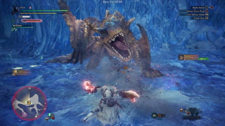 Tigrex ataca con varios movimientos difíciles de evitar. Frecuentemente levanta un brazo y embiste hacia adelante. Si mantienes tu distancia, se precipitará hacia ti y te atacará cuando esté cerca. Si estás junto a él, probablemente hará un ataque con giro. Hemos descubierto que si estás frente a su cabeza durante este ataque, lo puedes esquivar con facilidad. De otro modo seguramente te golpeará.