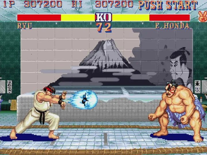 Muchos recordarán a Street Fighter II, en particular el nivel de E. Honda. En este escenario, en una especie de baño público, destacaba en un segundo plano un afiche de un actor de kabuki, el monte Fuji, además del diseño del Sol Naciente a la izquierda.