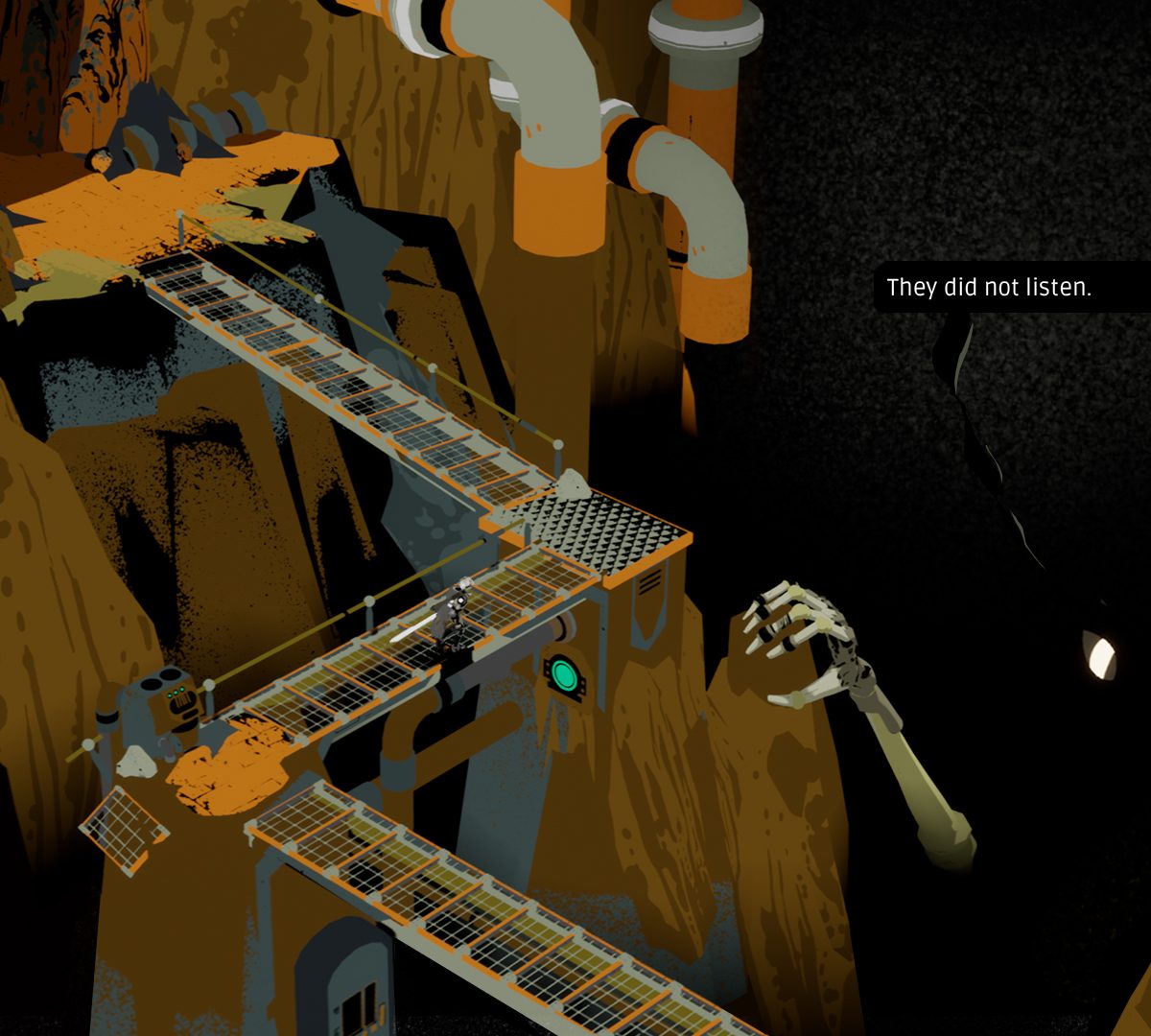La aventura comienza en un escenario bastante inhóspito, mientras controlamos a un robot que se mueve entre la arena hasta entrar a lo que parece ser una estructura abandonada hace decenas de años. Allí, utilizando un tubo como primera arma, comenzamos a familiarizarnos con exactamente cómo se integran estos elementos en la experiencia.